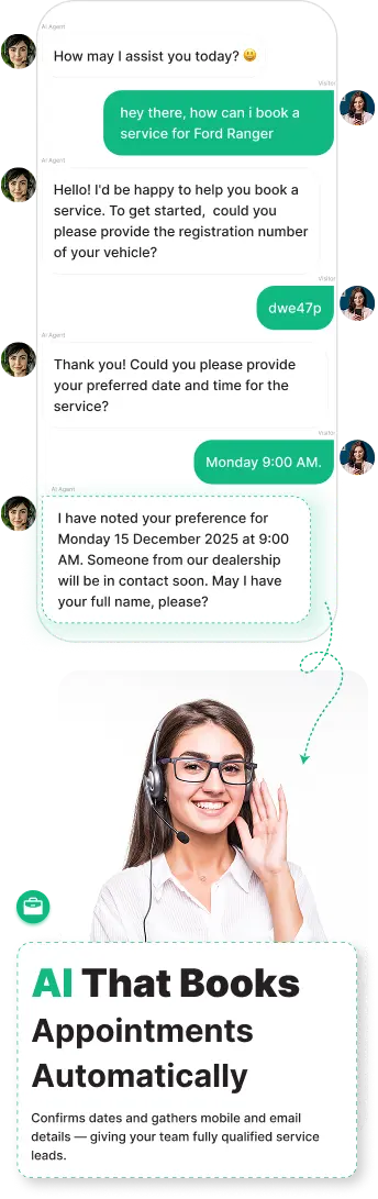 Powered by natural-language understanding and backed by human experts, Call EVA gives your business a voice that works 24/7. She can handle service bookings, trade-in enquiries, appointment confirmations, and missed-call follow-ups — all while maintaining a friendly, professional tone. Each conversation is logged, tracked, and turned into an actionable lead inside your CRM.